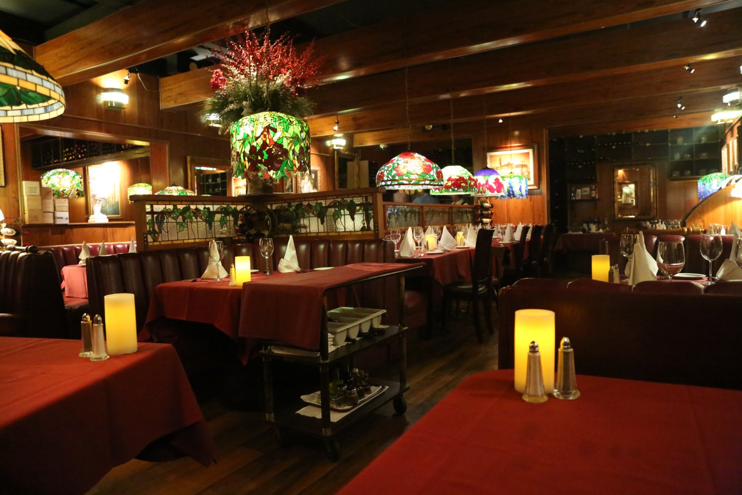 A dining experience feels quintessentially old Italian with the dimly lit dark booths and wines strategically placed throughout the restaurant. Also features a mini-art gallery with a number of original oil paintings hanging on the wooden panel walls (all for sale). Also a well-stocked and intriguing looking bar located in a side room next to the entrance is a fun space where guests can relax prior to their meals.