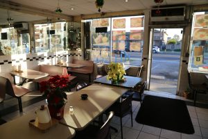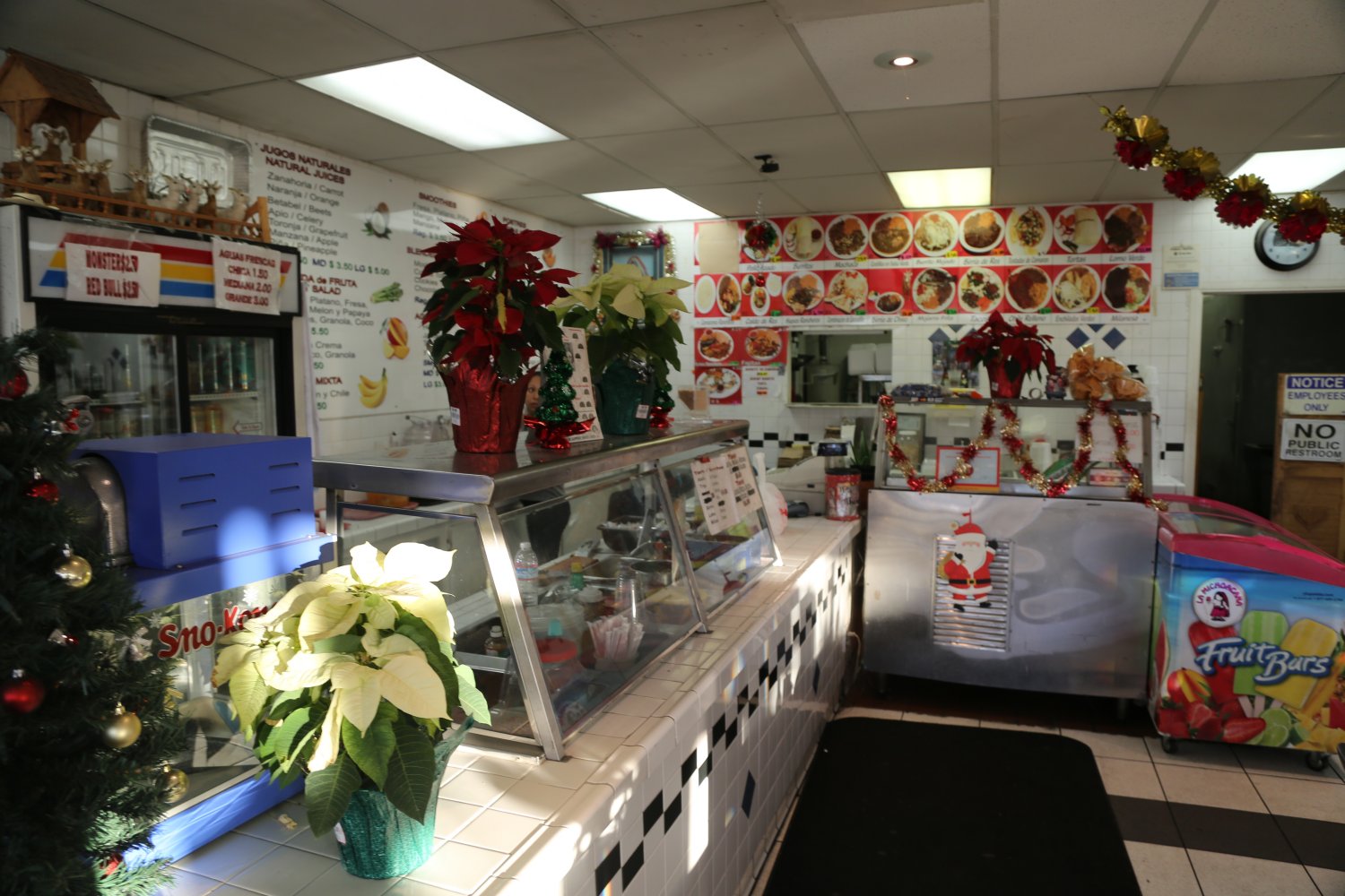 They provide on site dining or take away. On site includes only a few small tables. A dizzing array of menu items greets visitors upon entering – known for their fine selection of freshly made fruit juices and very flavorful burritos (burittos come with fresh radishes on the side and slices of lemon). Super quick service – a great value to quality ratio from a restaurant that one has to truly seek out to find.