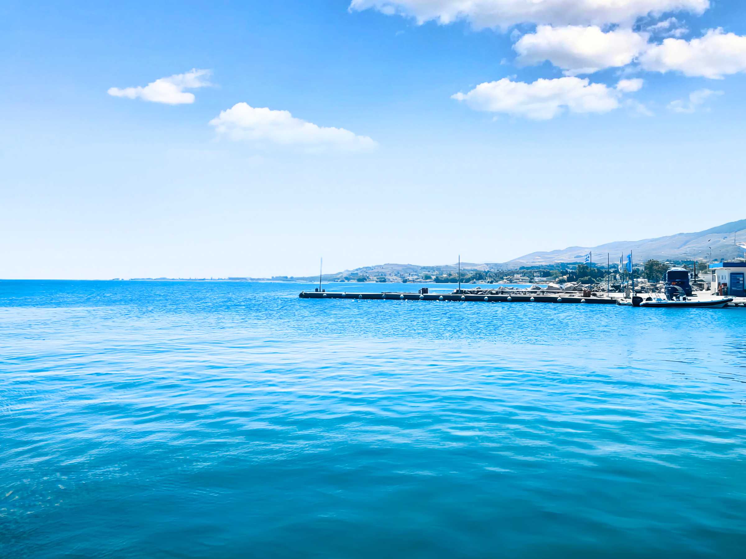 A tranquil scene of the Mediterranean Sea, with calm blue waters stretching towards a distant shoreline and mountains under a clear sky.